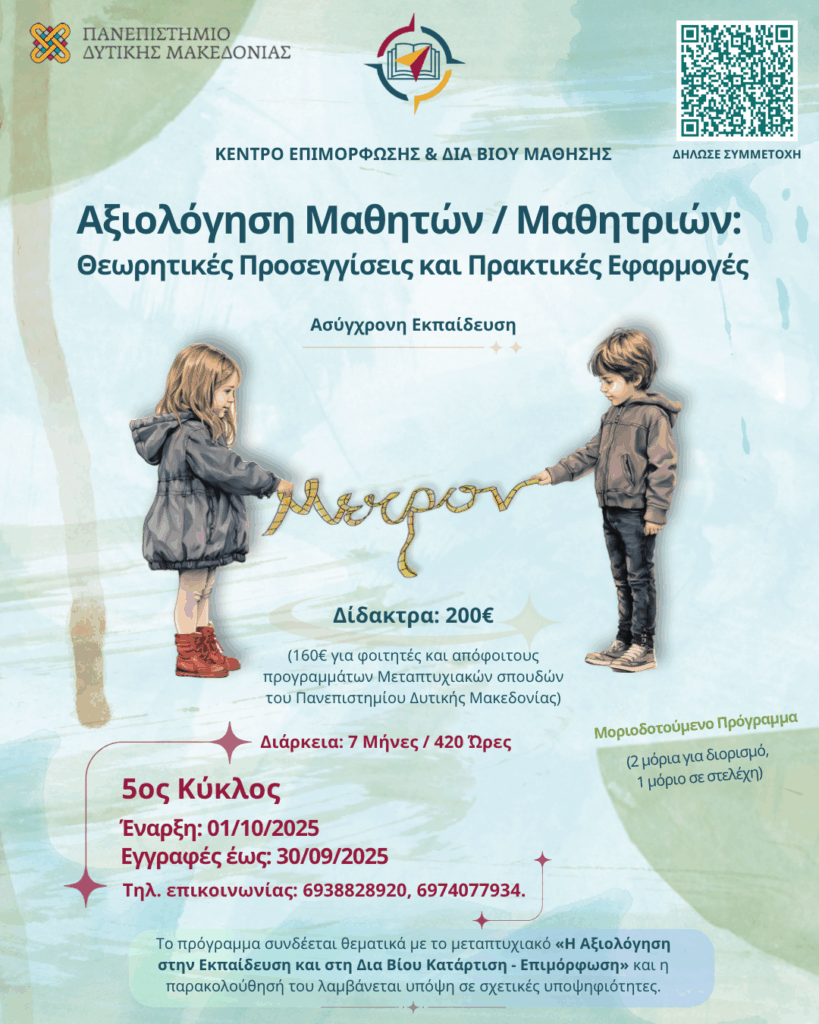 The Center for Training and Lifelong Learning (KEDIVIM) of the University of Western Macedonia implements the distance and asynchronous training program entitled: “Student Assessment: Theoretical Approaches and Practical Applications.”